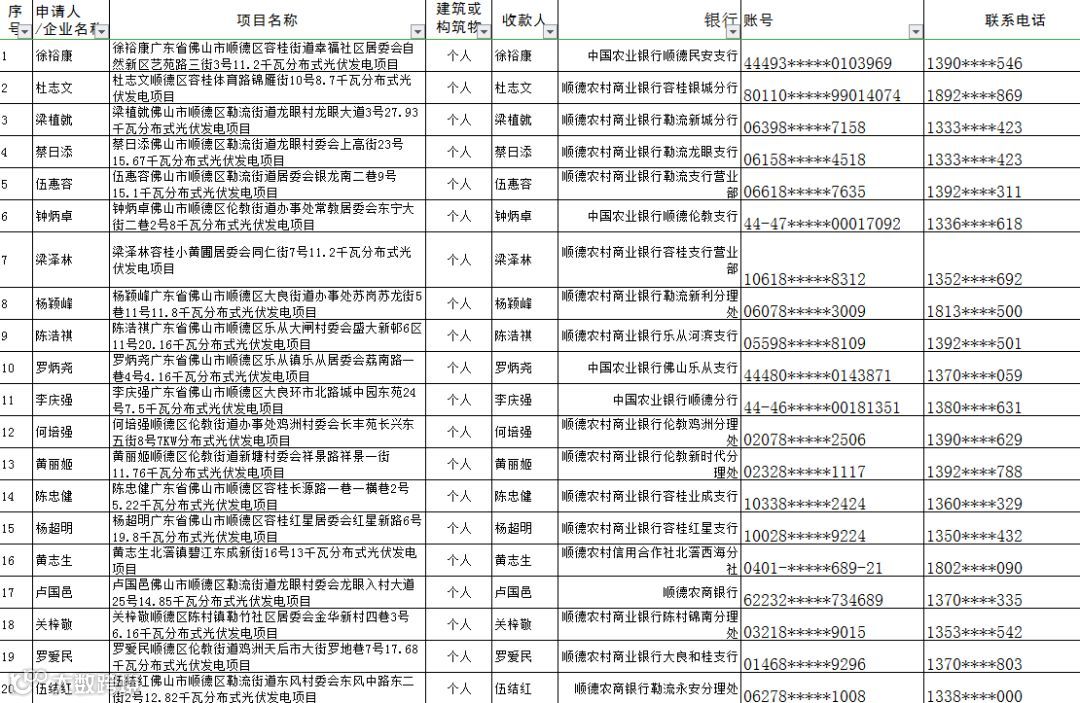 根据《佛山市人民政府办公室关于对2016—2018年建成光伏发电应用项目进行奖励和补助的通知》(佛府办〔2016〕57号)文件要求,顺德发统于今年初组织开展了2017年度顺德区光伏发电应用项目奖励和补助资金专项的申报工作,经项目征集、资料审查、上报市审核等程序,现将以上拟奖补的2017年顺德区光伏发电项目奖补资金收款账号予以公示。