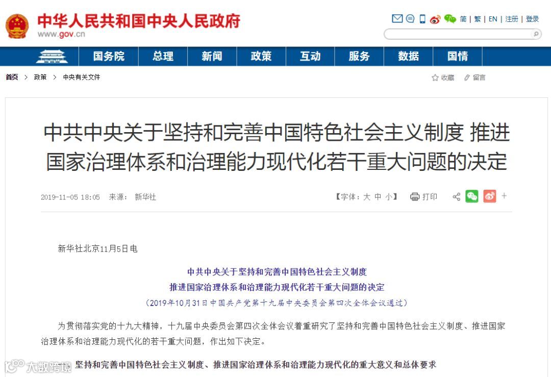 在进博会开幕、央行意外“降息”等一系列重磅事件之后,11月5日傍晚,新华社授权发布《中共中央关于坚持和完善中国特色社会主义制度 推进国家治理体系和治理能力现代化若干重大问题的决定》(以下简称《决定》),全文1.8万余字,由15部分构成。其中,第六部分,以1727字的篇幅对“坚持和完善社会主义基本经济制度,推动经济高质量发展”进行了详细阐述。