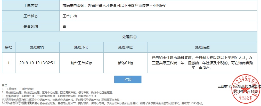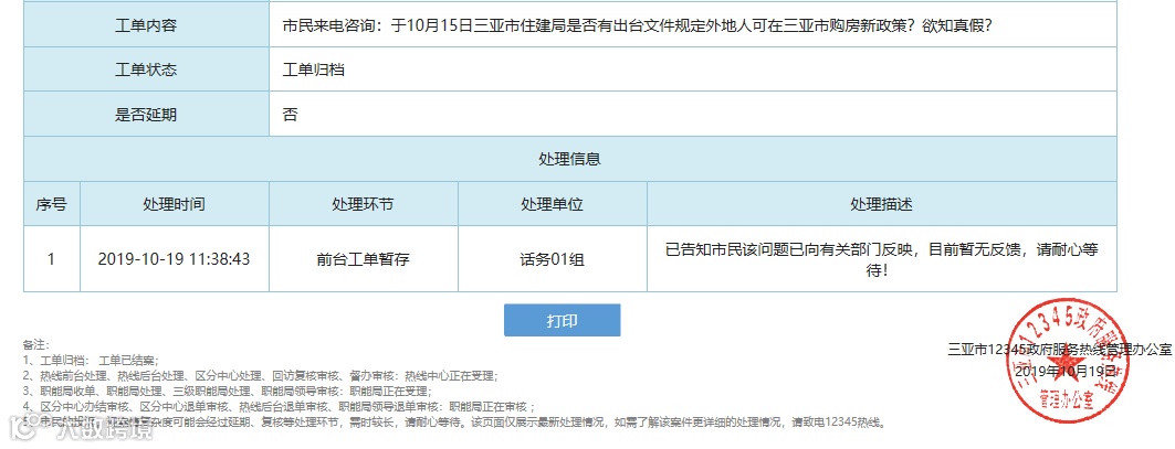 不过,券商中国记者在三亚住建局官网并未找到上述文件原文,但从三亚市政府网12345服务热线栏目看到,有市民咨询“于10月15日三亚市住建局是否有出台文件规定外地人可在三亚市购房新政策?欲知真假?”得到的官方回复是“已向有关部门反馈,目前暂无反馈。”