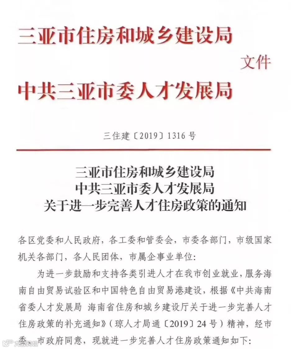 10月19日,网传三亚市住建局、三亚市委人才发展局联合发布了《关于进一步完善人才住房政策的通知》。