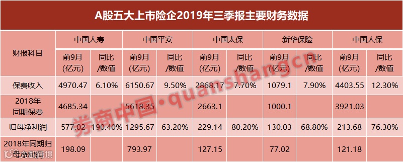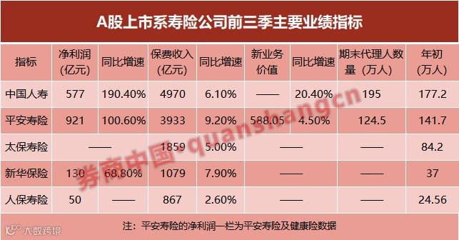 前三季度,中国人寿、中国人保、中国平安、中国太保、新华保险归母净利润分别为577.02亿元、213.68亿元、1295.67亿元、229.14亿元、130.03亿元,分别同比增长190.4%、76.3%、63.2%、80.2%和68.8%。