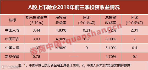 三季度末,新华保险的投资资产为7849.69亿元,较年初增长12.2%;年化总投资收益率为4.7%,同比微降0.1个百分点。