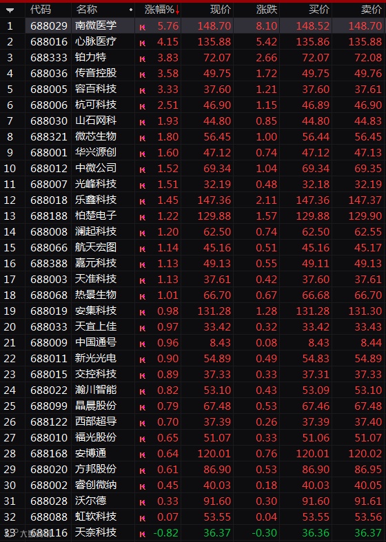 同时,科创板大面积飘红。截至收盘,33只科创板股票仅天奈科技单独收跌,其余全部上涨,南微医学上涨5.76%,股价刷新历史新高。