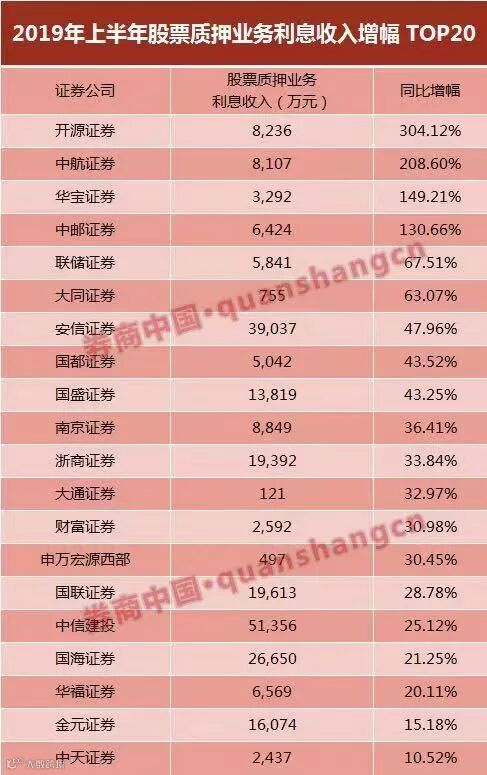 根据中国证券业协会公布的数据,今年上半年,股票质押利息收入同比增幅最大的10家券商为开源证券、中航证券、华宝证券、中邮证券、联储证券、大通证券、安信证券、国都证券、国盛证券和南京证券。南京证券今年上半年股票质押业务利息收入为8849万元,同比增长36.41%。在增幅排名中恰排第十位。