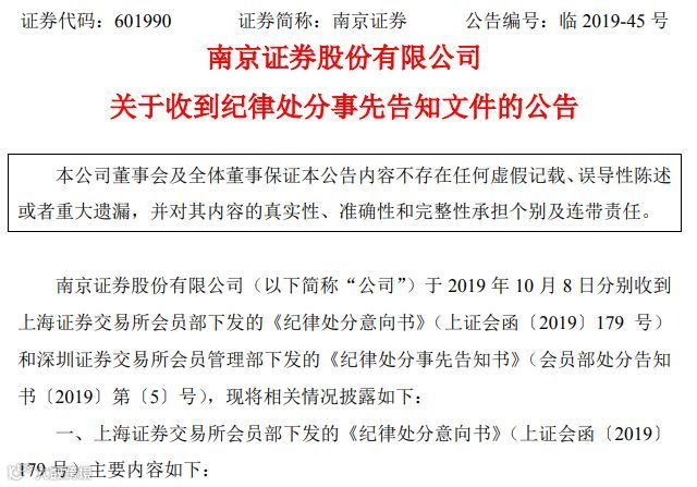 南京证券10月9日晚间公告,公司于2019年10月8日分别收到上海证券交易所会员部下发的《纪律处分意向书》和深圳证券交易所会员管理部下发的《纪律处分事先告知书》。