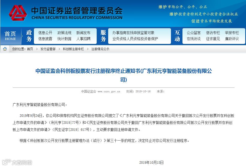 10月16日晚间,证监会官网公布利元亨的股票发行注册程序终止通知书。终止通知书显示,利元亨及保荐券商民生证券于9月24日提交了撤回注册文件的申请,距今已有10余个工作日。