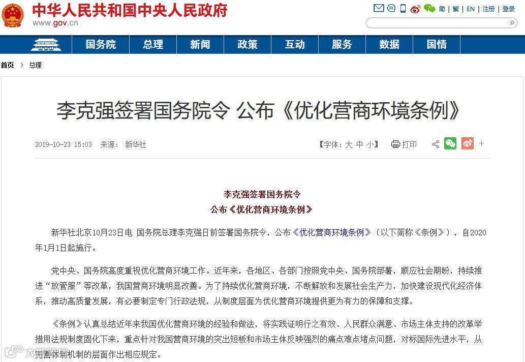 国务院总理李克强日前签署国务院令,公布《优化营商环境条例》(简称《条例》),《条例》总结近年来我国优化营商环境的经验和做法,将实践证明行之有效、人民群众满意、市场主体支持的改革举措用法规制度固化下来,重点针对我国营商环境的突出短板和市场主体反映强烈的痛点难点堵点问题,对标国际先进水平,从完善体制机制的层面作出相应规定。