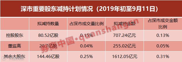 其实这些减持计划完成度并不高。根据进展公告显示,从2019年初至9月11日,深市重要股东实际减持64亿股,占减持计划拟减持股份的26.95%,占减持期限内公司累计成交量的0.11%;实际减持金额约673.27亿元,占减持计划拟减持金额的26.15%,占减持期限内公司累计成交额的0.44%;实际减持规模占公司流通盘比例很小。在已提前终止或实施完成的减持计划中,实际全额完成减持计划的股东仅占45.25%,大部分股东未充分减持。总体来看,重要股东实际减持数量远低于其计划数量。