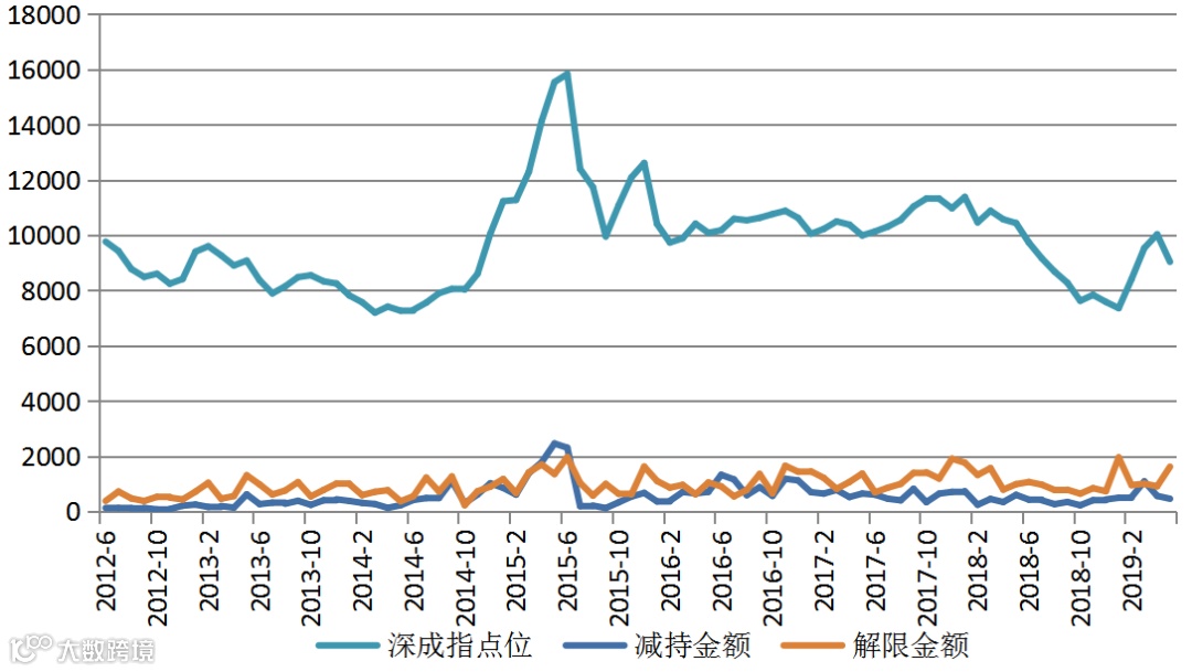 深市主体减持金额、解限金额、深证成指走势关系图