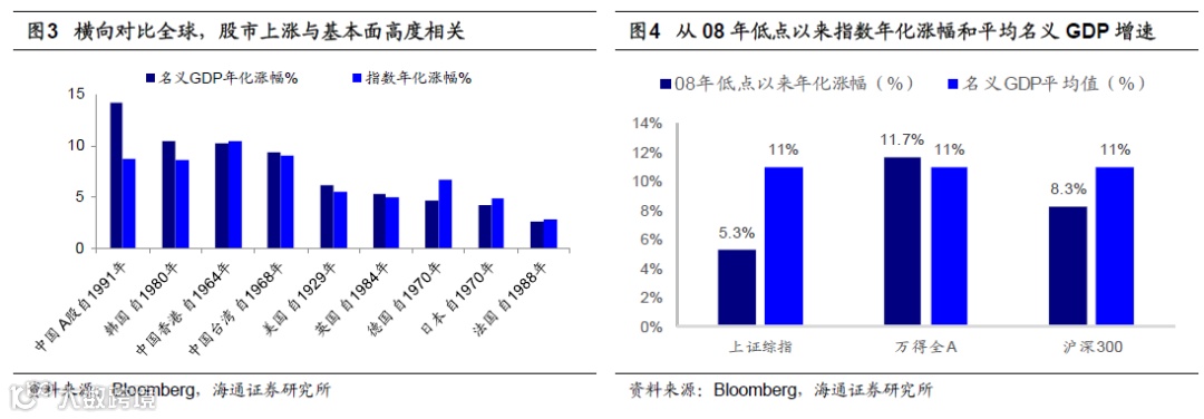 拉长时间,股市的收益率与基本面高度相关。前期报告中我们分析过,长期来看股市收益率与基本面相关性较强。对比10年前,在09年10月16日A股刚刚经历了08/10-09/8的大幅上涨,指数处于相对高位。因此如果简单对比09/10至今的上证综指年化涨幅与经济增速的关系,结论会有偏差。A股在08年大幅下跌,市场经历了出清,如果从08年低点开始,用更能代表股市的万得全A指数来计算,近10年A股指数年化涨幅与同期名义GDP增速已经接近。从08年低点以来,万得全A从1207点涨至目前4089点,年化涨幅11.7%。而08年以来名义GDP增速年化增速约11%,万得全A年化涨幅与名义GDP增速相近。把时间拉的更长来看,前期报告中我们也分析过全球股市长期收益率,及其与经济增速之间的关系。横向对比全球,各地股指年化涨幅与GDP名义年化增速表现出高度相关,经济增速越高的国家股市表现越强劲。