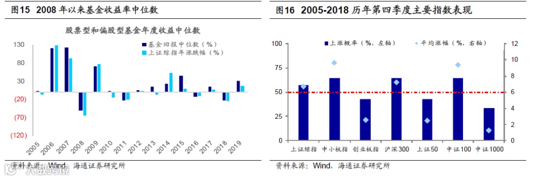 牛市第2波上涨初期折返跑是布局期。我们前期多篇报告分析过,1月4日上证综指2440点是牛市反转点,上证综指2440-3288-2733点,是牛市第一阶段的进二退一,上证综指2733点附近很可能是牛市第二波上涨的起点,对应波浪理论的3浪,即牛市主升浪。历史上牛市第二波上涨的时间和空间都会明显大于第一波上涨,如06/01-07/03、09/01-09/11、14/03-15/02,持续12-20个月,指数最大涨幅70-180%之间。牛市第二波上涨需要基本面、政策面共振,初期在确认基本面或政策面变好前市场会有反复,如同跑步加速前在起点附近折返跑做热身,市场需反复震荡盘整后才会加速上涨,05/12-06/1期间上证综指一直在1100点上下反复盘整,08/12-09/1期间上证综指一直在1800-2000点盘整,14/3-14/6月期间上证综指一直在2000点上下盘整,详见《热身阶段的折返跑-20190922》、《折返跑未完-20191007》。8月初上证综指2733点是中美贸易摩擦恶化、港股大跌、人民币汇率破7、国内经济数据下滑等各类因素叠加下的恐慌低点,8月中恢复到6月初低点后,最近2个月整体是折返跑的盘整,借鉴历史,这是牛市第二波上涨初期的特征,真正的加速需要确认基本面或政策面向好,四季度后半段到明年初,即岁末年初是个窗口期。此外,截至19/10/18股票型基金以及偏股混合型基金今年以来净值回报中位数为29.8%,部分投资者担忧这种高回报的现象未来难以持续。回顾2005年以来股票型和偏股混合型基金回报率中位数,其曾经在06年-07年(06年基金回报率中位数为120%,07年为124%),13年-15年(2013年为14.5%,2014年23.2%,2015年45%)连续保持较高水平。并且2019年基金收益率较高,与2018年股市大跌也有一定关系。2018年上证综指跌幅24.7%,跌幅仅次于08年的65%,2018年基金回报率中位数为-24%,与2011年相近,同样仅次于08年,因此不必因为19年基金收益率较高就担忧未来基金收益的可持续性。