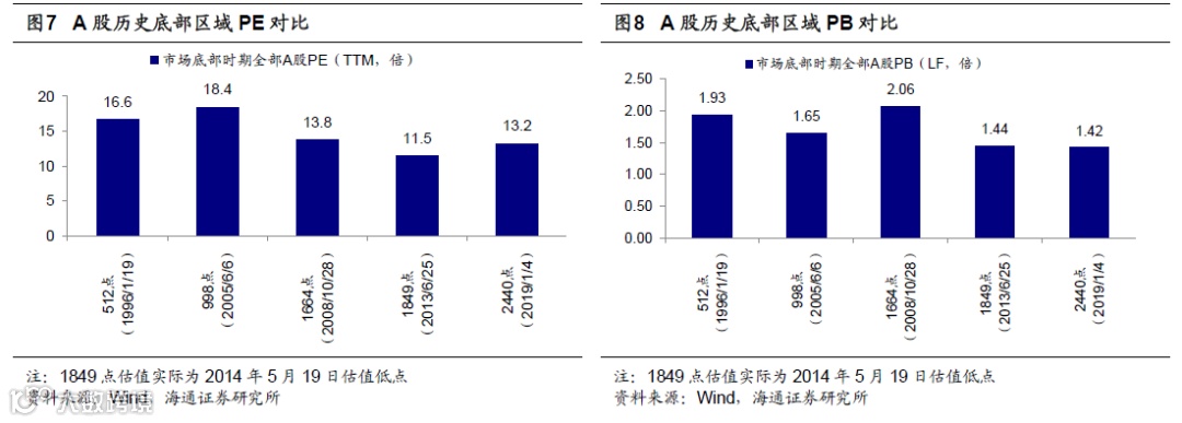 根据库存周期和政策时滞,我们预计上市公司利润同比19Q3见底,之后进入一年半左右回升周期,即经济平盈利上,因此,上证综指2733点附近很可能是牛市第二波上涨的起点,对应波浪理论的3浪,即牛市主升浪。借鉴05-07年、08-10年、12-15年三轮牛市,牛市第二波上涨需要基本面、政策面的共振,但是基本面和政策面的确认是个逐步的过程,因此历史上市场在主升浪初期仍会折返跑,反复盘整,详见前期报告《加速前的热身-20190915》、《热身阶段的折返跑-20190922》、《折返跑未完-20191007》等。做个简单的测算,以上证综指年初低点2440点为市场底部,假设未来A股整体估值水平不变,盈利增长推动指数上行,而19Q3名义GDP增速为7.9%,19Q2全部A股净利润增速6.5%,按此推算上证综指的底部自然抬升到2600-2650点。实际上,年初上证综指2440点时,市场情绪极度悲观,当时全部A股PE(TTM)降至13.2倍,PB(LF)降至1.42倍,均处于市场底部。目前市场情绪明显好于年初上证综指2440点时,粗略点看2733点很可能已经是牛市第一阶段进二退一的底部,即牛市第二波上涨的起点。