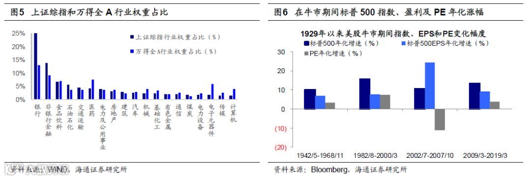 从行业结构来看,由于上证综指是按成分股总市值加权计算,而万得全A指数是按流通市值加权计算。这使得上证综指中传统产业权重过高。如金融地产、食品饮料、石油石化、交运等传统行业在上证综指成分股中市值占比达63%,而这些行业在全体A股中占比仅44.6%。具体来看,银行在上证综指中权重为25%(高于银行在万得全A中的权重13%,下同),非银金融权重14%(9.2%),石油石化5.6%(4%)。而新兴产业在上证综指中权重较低,如医药占比4.4%(医药在万得全A中权重7.6%,下同),电子元器件1.8%(6.1%)、计算机1.5%(3.9%)等。