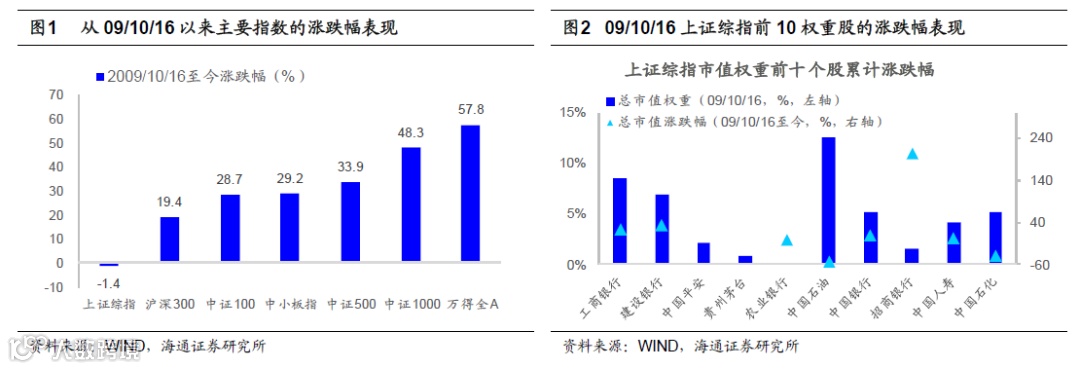 过去十年上证综指没涨,而其他指数涨幅可观。虽然上证综指10年不涨,但其他指数涨幅近10年明显上涨。从09/10/16至今,沪深300指数累计涨幅21%,中证100涨30.7%,中小板指涨30.7%,中证1000涨48.3%,万得全A累计涨57%。近10年上证综指不涨,这主要源于指数的编制问题。上证综指成分股中只包含了上交所上市的企业,而过去10年中国经济处于转型期,大量代表转型的新兴行业公司在深交所上市,这部分企业在过去10年中涨幅较大,而其上涨未在上证综指中得到体现。