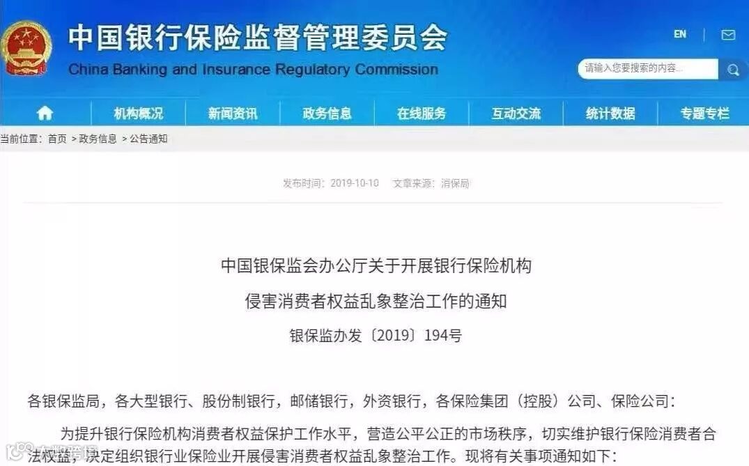10月10日,银保监会发布《中国银保监会办公厅关于开展银行保险机构侵害消费者权益乱象整治工作的通知》(银保监办发[2019]194号),明确本次侵害消费者权益乱象整治的工作重点内容,并强化整治问责,要求银行保险机构对机构自查和监管抽查发现的问题要逐一建档立案,严格自查自纠,一次性问责到位。