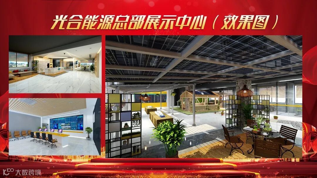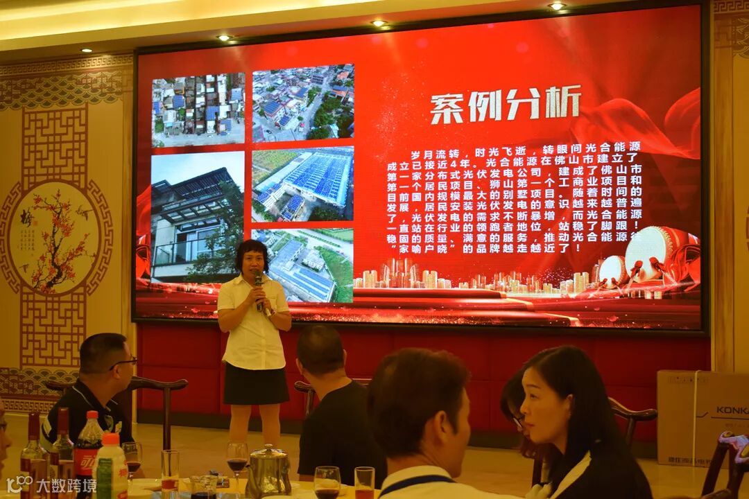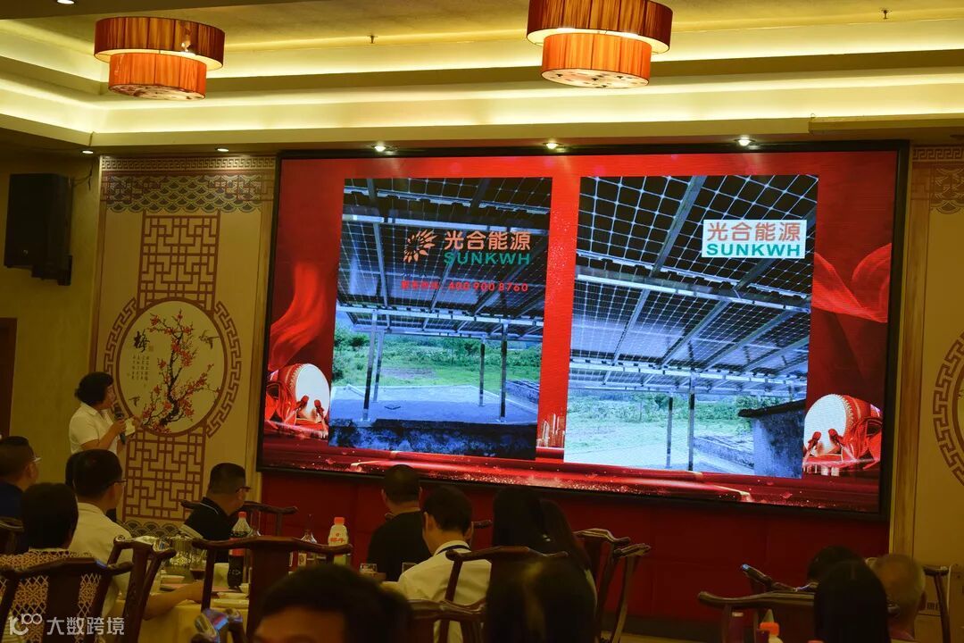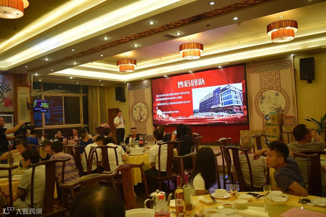 宴会现场摆设光合能源最新产品:双玻双面组件、华为逆变器、黑铝支架等等,产品全面升级,同等投资,更高收益。
