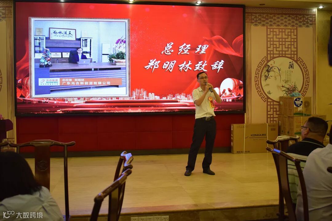 首先,光合能源总经理郑总上台致辞。感谢客户朋友一直的支持,光合能源不断发展扩张,总部正在筹备建设体验展示中心,让客户更直观形象体验光伏电站。