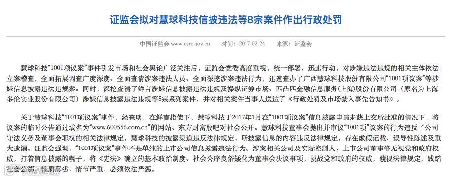于是,经过监管机构的紧急立案稽查,证监会在2017年2月宣布,拟决定对匹凸匹涉嫌信息披露违法违规系列案件处以570万元罚没款;对鲜言涉嫌信息披露违法违规及操纵股价案处以约34.7亿元罚没款;对慧球科技涉嫌信息披露违法违规系列案件处以943万元罚没款。拟罚没金额总计近34.8亿元。同时拟对鲜言等11名当事人采取终身证券市场禁入措施。