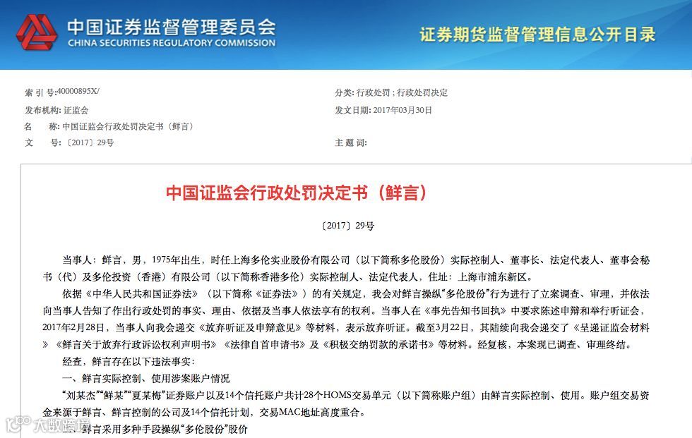 到了当年3月,证监会对鲜言操纵“多伦股份”、信息披露违法的行为开出了约34.7亿元的罚单,刷新了历史记录。当然,鲜言并没有缴纳这笔巨额罚金,并因此在2018年7月2日,入选第二批资本市场“老赖”名单。