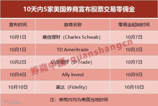 不过,当10月1日,美国最大在线券商嘉信理财宣布将股票、ETF和期权的在线交易佣金从4.95美元降至0美元时,整个金融行业还是有点措手不及。随后,TD Ameritrade、E*Trade以及未上市的 Ally Invest 等美国经纪商纷纷跟进,将交易佣金降为零。