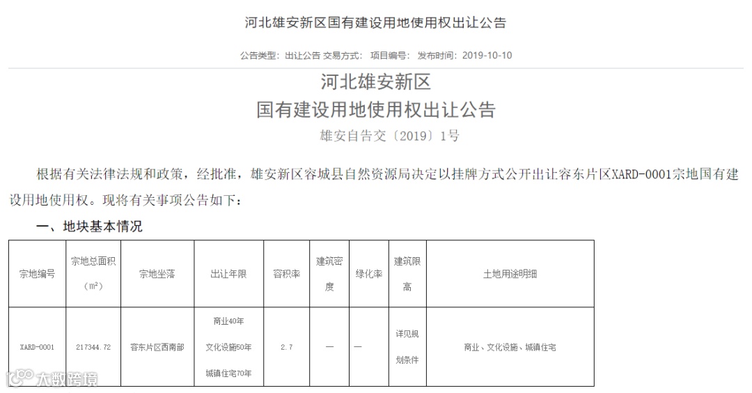 10月10日,雄安新区容城县自然资源局挂牌出让一宗土地,这是雄安新区首次公开卖地,该地用于建设雄安商务服务中心项目,标志着雄安新区大规模城市开发建设进入实施阶段。