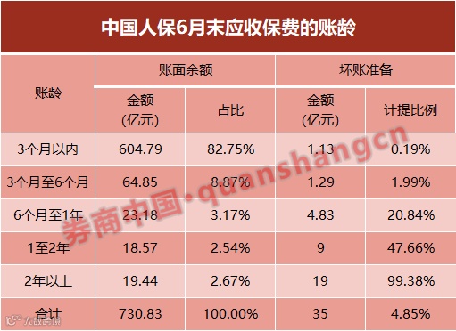 从中国人保和中国太保披露的数据看,应收保费的账龄大多在3个月以内,显示其信用风险还较小。以中国人保为例,6月末730亿应收保费中,80%以上的账龄为3个月以内,也就是说对应的保单为3个月以内的最新签单,保费收不回的风险还极小。