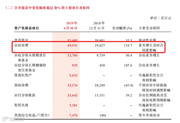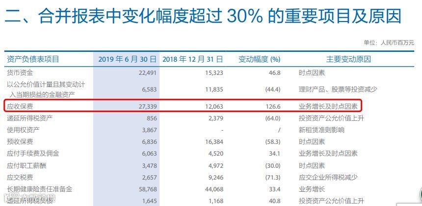 中国太保2019年半年报披露了各险种的应收保费情况。其中,应收保费金额和增幅较大的是保证保险、农业保险,这两个险种的应收保费压力明显高于其他业务。