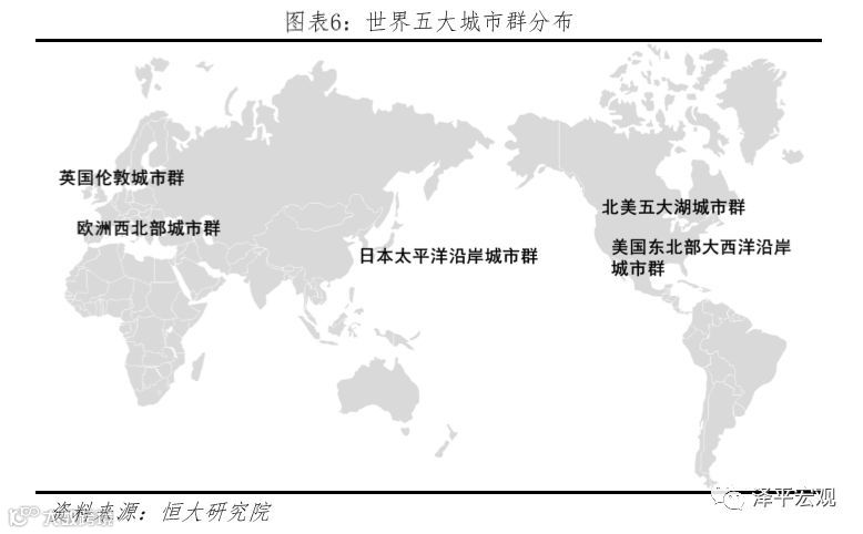 国际公认的世界级城市群有以纽约为核心的美国东北部大西洋沿岸城市群、以芝加哥为核心的五大湖城市群、以东京为核心的日本太平洋沿岸城市群、以伦敦为核心的英伦城市群、以巴黎为核心的欧洲西北部城市群等。1)美国东北部大西洋沿岸城市群以纽约、波士顿、华盛顿等城市为核心,土地面积13.8万平方公里、占全国的1.5%,集中了美国总人口的20%,制造业产值占全美的70%,城市化水平达到90%以上,是美国最大的生产基地、商贸中心和世界最大的金融中心。2)五大湖城市群集中了美国30%以上的制造业,其汽车产量和销售额约占美国的80%,与美国东北部大西洋沿岸城市群共同构成北美制造业带,钢铁产业集中在匹兹堡,汽车产业集中在底特律。土地面积24.5万平方公里,人口约5000万。核心城市芝加哥是美国重要的交通枢纽,也是美国主要的金融、期货和商品交易中心之一。3)日本太平洋沿岸城市群由东京都市圈、大阪都市圈和名古屋都市圈组成,集聚日本80%以上的金融、教育、信息和研发机构。土地面积3.5万平方公里、占日本国土的6%,人口近7000万、占总人口的61%。核心城市东京是日本政治、经济、文化和交通中心。4)英国伦敦城市群是世界三大金融中心之一,由伦敦-利物浦一线的城市构成,其中包括世界纺织工业之都-曼彻斯特、纺织机械重镇-利兹、伯明翰、谢菲尔德等大城市,土地面积约4.5万平方公里,人口3650万、占总人口的55%。核心城市伦敦贡献了全国约20%的GDP,是欧洲最大的金融中心。5) 欧洲西北部城市群由大巴黎地区城市群、莱茵-鲁尔城市群、荷兰-比利时城市群构成,主要城市有巴黎、阿姆斯特丹、鹿特丹、海牙、安特卫普、布鲁塞尔、科隆等。土地面积约14.5万平方公里,人口约4600万。其中,巴黎是法国的经济中心和最大的工商业城市,也是西欧重要的交通中心之一。