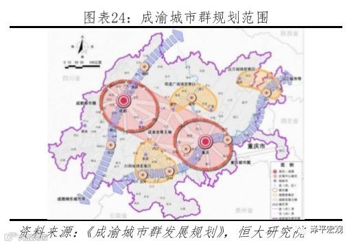 NO4.成渝城市群:培育中国经济增长“第四极”。1)成渝2018年城镇化率达53.8%、西南最高,处于全国“两横三纵”城市化战略格局沿长江通道横轴和包昆通道纵轴的交汇地带,战略地位突出,极具发展潜力。2)成渝产业协同度较低,未来将推进新型工业化、信息化和农业现代化,打造全国重要的先进制造业和战略性新兴产业基地,建设长江上游地区金融中心和全国重要的商贸物流中心。3)成渝内部缺少重要节点城市,成渝两地产业分工协作不够充分、竞争大于合作,创新能力不足。