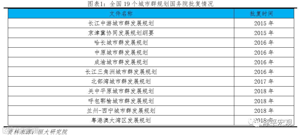 2006年“城市群”第一次出现在中央文件,2013年以来中央要求把城市群作为推进国家新型城镇化的主体形态。2006年国家“十一五”规划提出,把城市群作为推进城镇化的主体形态。2007年十七大报告指出,以大城市为依托,形成辐射作用大的城市群,培育新的经济增长极。2012年十八大报告指出,继续实施区域发展总体战略,科学规划城市群规模和布局。2013年中央城镇化工作会议提出,要在中西部和东北有条件的地区,依靠市场力量和国家规划引导,逐步发展形成若干城市群。2014年《国家新型城镇化规划(2014-2020年)》及“十三五”规划要求建设长三角、珠三角、京津冀、山东半岛、海峡西岸、哈长、辽中南、中原、长江中游、成渝、关中平原、北部湾、山西中部、呼包鄂榆、黔中、滇中、兰州-西宁、宁夏沿黄、天山北坡等19个城市群。2017年十九大报告指出,以城市群为主体构建大中小城市和小城镇协调发展的城镇格局。2018年中共中央国务院《关于建立更加有效的区域协调发展新机制的意见》明确指出,以京津冀城市群、长三角城市群、粤港澳大湾区、成渝城市群、长江中游城市群、中原城市群、关中平原城市群等城市群推动国家重大区域战略融合发展,建立以中心城市引领城市群发展、城市群带动区域发展新模式,推动区域板块之间融合互动发展。2015年至今,国务院已批复11个城市群规划。