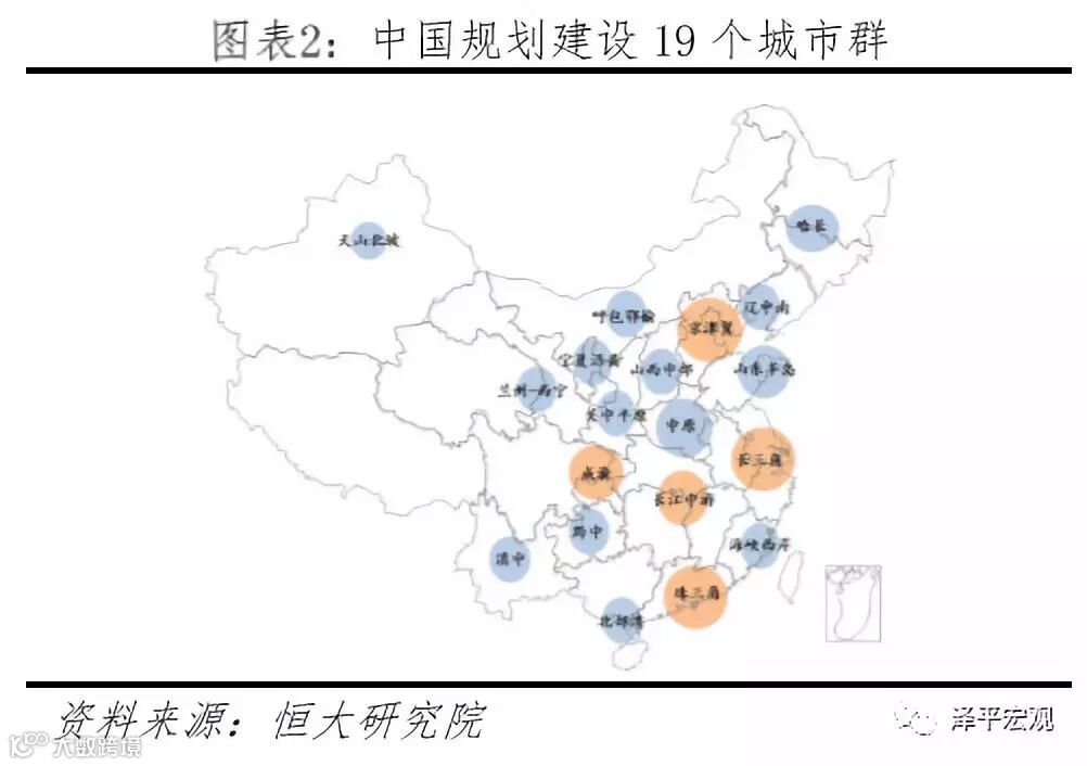 19个城市群以25%土地集聚75%人口,创造88%GDP,其中城镇人口占比78%。目前大部分城市群依旧需要进一步的发展和培育。城市群更具生产效率,更节约土地、能源等,是支撑中国经济高质量发展的主要平台,是中国当前以及未来发展的重点。根据恒大研究院2019年4月报告《中国城市发展潜力排名:2019》,发展潜力百强城市中有96个位于19大城市群。19个城市群土地面积合计约240万平方公里,占全国的1/4。1982-2018年,19个城市群常住人口从7.1亿增至10.5亿,人口占比从70.3%增至75.3%。2018年城镇化率达到61.7%,即城镇人口6.5亿,占全国城镇人口的78.3%;GDP合计79.3万亿,占全国的88.1%。长三角、京津冀、成渝、长江中游、山东半岛五个城市群人口过亿,分别为1.5亿、1.1亿、1.0亿、1.3亿、1.0亿。中原、珠三角、海峡西岸、哈长、北部湾、关中平原六个城市群人口均在4000-7000万之间,辽中南、黔中、滇中三个城市群人口在2000-4000万,而山西中部、兰州-西宁、呼包鄂榆三个城市群人口在1000-2000万,宁夏沿黄、天山北坡城市群不到700万。目前大部分城市群建设尚不成熟。一方面,多数城市群中心城市尚处于集聚阶段,对周边中小城市的辐射带动作用不强;另一方面,城市群内的各城市之间由于利益因素互相博弈,协调机制不健全,城市群之间也存在同质化竞争、资源错配等问题。
