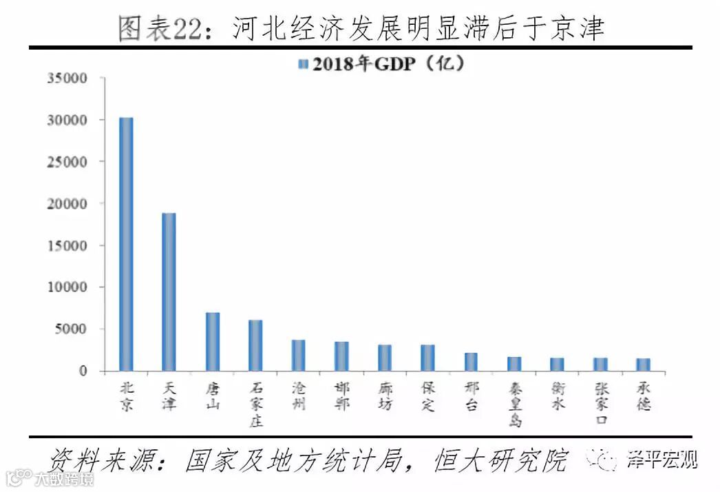 京津冀城市群城镇规模等级不合理,发展不平衡明显。第一,以城区常住人口计算,2017年京津冀城市群共有1000万以上的超大城市1个(北京)、500万以上1000万以下的特大城市1个(天津)、300万以上500万以下的I型大城市2个(石家庄、唐山)、100万以上300万以下的II型大城市4个(保定、张家口、秦皇岛、邯郸)、50万以上100万以下的中等城市5个(廊坊、承德、沧州、邢台、衡水),城镇规模等级呈现出明显的两极分化特征。第二,北京、天津实力明显高于其他城市,表现出更强的集聚能力,成为人才和创新高地,河北发展滞后,辐射带动能力弱。从GDP看,北京2018年GDP超3万亿,天津超1.8万亿,而其余城市均低于8千亿;从上市公司看,2017年北京有459个A+H股上市公司,天津有62个,其余城市合计仅71个;从公共资源看,北京每千人执业(助理医师)4.4人,天津市和河北省均低于3人,北京985+211合计35所,天津3所,河北仅1所;从高铁日均班次看,2018年北京高铁日均班次为735趟,天津为744趟,其余城市皆低于500趟。