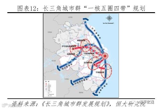 长三角一体化始于1982年,至今已走过近40年的历程。1982年,“以上海为中心建立长三角经济圈”的设想正式提出,最初范围包括上海、南京、宁波、苏州和杭州,之后不断扩容。2008年9月国务院颁布《关于进一步推进长江三角洲地区改革开放与经济社会发展的指导意见》,提出要把长三角地区建设成为亚太地区重要的国际门户和全球重要的先进制造业基地,具有较强国际竞争力的世界级城市群。2016年5月国务院通过的《长三角城市群发展规划》提出构建“一核五圈四带”的网络化空间格局,其中“一核”即提升上海全球城市功能,打造世界级城市群核心城市;“五圈”即促进南京、杭州、合肥、苏锡常、宁波五个都市圈同城化发展。未来长三角城市群发展在于5大都市圈的同城化,这些城市本身已积攒足够能量,开始向外输出,带动所在片区发展。2018年11月,国家主席习近平在首届中国国际进口博览会开幕式发表演讲时提到,将长江三角洲区域一体化发展上升为国家战略。2019年1月,上海市市长在《政府工作报告》中指出,要全力实施长江三角洲区域一体化发展国家战略,合力推进长三角一体化发展示范区建设。目前中央已明确在江苏苏州吴江、浙江嘉兴嘉善和上海青浦建设生态绿色一体化发展示范区。