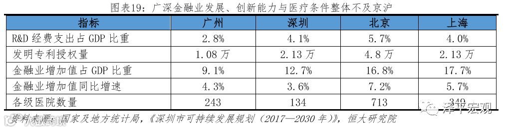 除深圳外,珠三角城市主要以中低端制造业为主,自主创新能力有待提高,优质公共资源短缺。第一,珠三角城市大都以中低端制造业为主。珠三角城市群产业发展得益于20世纪80年代初和90年代初国际上的两次产业大转移,均以劳动密集型为主,产业结构趋同。除深圳外,其余城市的当前支柱产业仍集中于机械制造、金属冶炼、纺织、食品、化工等中低端制造业,金融、信息、新能源、新材料等产业发展缓慢。以金融业为例,2018年广州、深圳金融业增加值占GDP比值分别为12.7%、9.1%,而北京、上海达16.8%、17.7%;从增速看,北京金融业增加值同比增速为7.2%,上海为5.7%,广州、深圳分别仅为4.3%、3.7%。第二,珠三角城市群与长三角、京津冀城市群相比,核心城市的自主创新能力仍待提高。2018年广州、深圳R&D经费支出占GDP的比值分别为2.8%、4.0%,而北京、上海已经分别达到5.7%、4.1%。2018年广州、深圳发明专利授权量为1.1万件、2.1万件,低于北京、上海的4.8万件、2.13万件。第三,优质公共服务资源短缺已成为制约珠三角城市群发展的瓶颈。教育方面,珠三角城市群仅有中山大学、华南理工大学等4所985和211高校,而京津冀、长三角城市群均超过20所;医疗方面,广州、深圳各级各类医院数量分别为243家、134家,远低于北京、上海的713、349家。