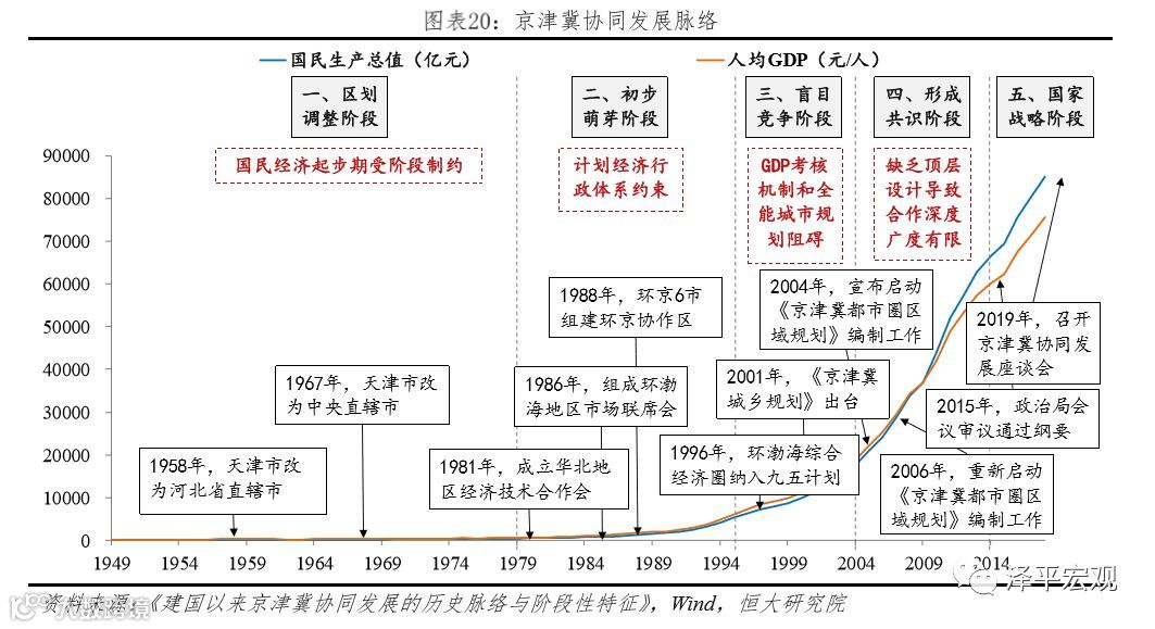 从2001年《京津冀城乡规划》出台开始,京津冀一体化顶层设计不断加强。2014年习近平总书记在京津冀三地协同发展座谈会上首次将京津冀协同发展上升到国家战略层面。此后,《京津冀协同规划纲要》、《“十三五”时期京津冀国民经济和社会发展规划》、《京津冀产业转移指南》等陆续出台。北京被中央定位为政治中心、文化中心、国际交往中心、科技创新中心,要求建成国际一流的和谐宜居之都。在北京功能定位发生深刻变化的同时,通州副中心加快建设、雄安新区设立并规划建设,以东城、西城为主的首都特区或呼之欲出。未来首都或与北京分开,首都是首都,北京是北京。区域整体定位体现了“一盘棋”的思想,突出了功能互补、错位发展:北京是全国政治中心、文化中心、国际交往中心、科技创新中心,天津是全国先进制造研发基地、北方国际航运核心区、金融创新运营示范区、改革开放先行区,河北省是全国现代商贸物流重要基地、产业转型升级试验区、新型城镇化与城乡统筹示范区、京津冀生态环境支撑区。规划重点包括三个方面:一是疏解非首都功能;二是全方位对接支持河北雄安新区规划建设,建立便捷高效的交通联系;三是高水平规划建设城市副中心,深入推进京津冀协同发展,发挥北京的辐射带动作用,打造以首都为核心的世界级城市群。