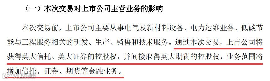 通过本次交易,置信电气将获得英大信托、英大证券的控股权,并间接取得英大期货的控股权,业务范围将增加信托、证券、期货等金融业务。与此同时,置信电气计划向不超过10名投资者非公开发行股票募集不超过30亿元的配套资金,在扣除相关费用后全部用于向英大证券增资。