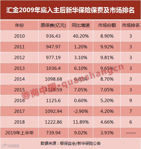 中央汇金2009年底“入主”新华保险,到今年,正好满十年。汇金入主以来,自2010年到2015年,新华保险都位居行业第三,在这个位置上长达6年。2016年转型开启,价值增长、保费增长较低,保费自2015年到2017年连续维持在1100亿元附近,而同期寿险业保费年增长都在20%以上。期间,市场份额下滑,保费排名一度降至第十名开外,如今步入转型收获期,排名回升至第六位,而这离昔日的第三仍有差距。