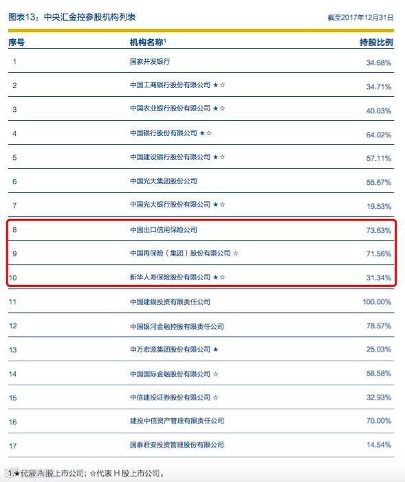 据券商中国记者梳理,中投公司在2017年年报中首次有单独介绍中央汇金经营情况的章节,并将中央汇金直接持有17家金融机构股权(包括银行、证券公司、保险公司及综合性金融机构)列示出来。