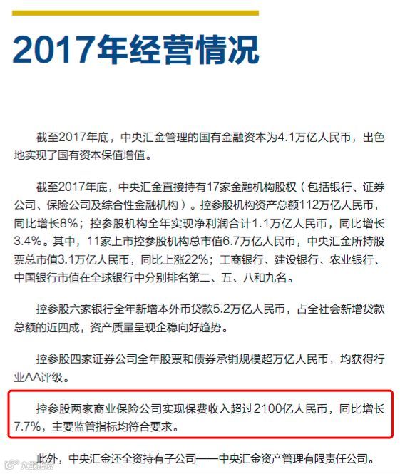 中投公司2017年年报中,对中央汇金的银行、证券、保险板块业绩分别有简要介绍,其中,保险明确列示的一个指标是保费——控参股两家商业保险公司(即中再集团、新华保险)实现保费收入超过2100亿人民币,同比增长7.7%,主要监管指标均符合要求。