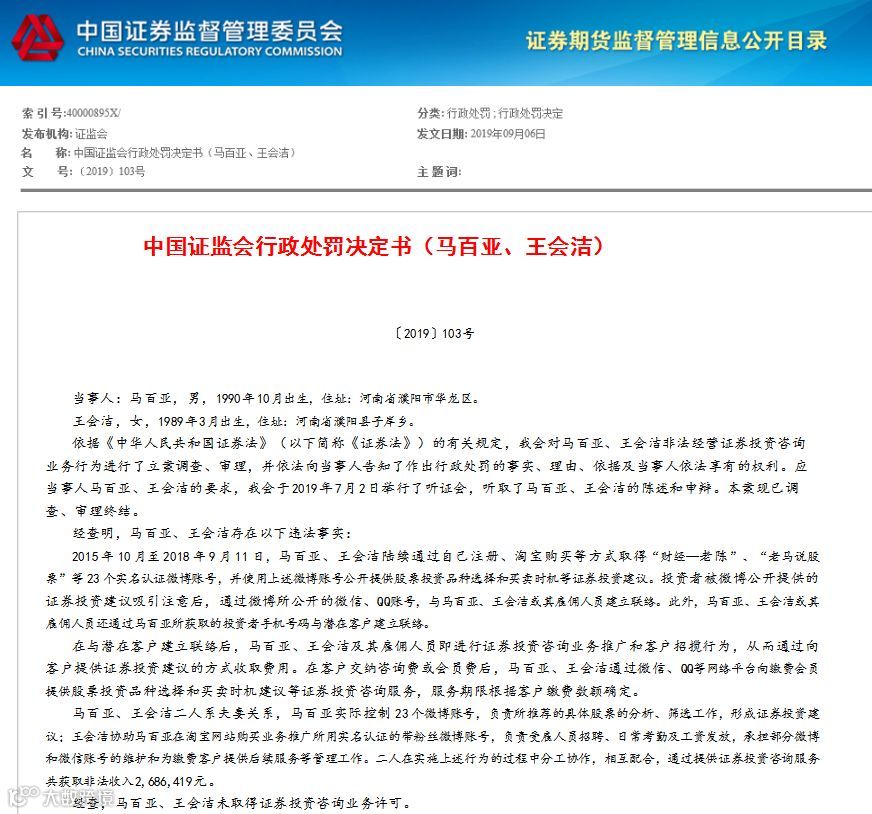 证监会最新的行政处罚书显示,马百亚、王会洁两夫妻因陆续通过自己注册、淘宝购买等方式取得“财经—老陈”、“老马说股票”等23个实名认证微博账号,并使用上述微博账号公开提供股票投资品种选择和买卖时机等证券投资建议,被证监会采取了“没一罚一”的行政处罚,没收违法所得268万元,并处以268万元罚款。