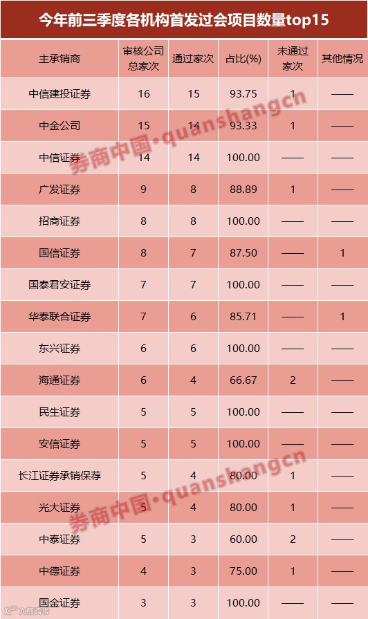 看前三季度各投行的表现,就过会企业数量来看,中信建投证券有15家企业过会,位居第一;中金公司、中信证券分别有14家企业过会;广发、招商分别有8家企业过会;国君、国信分别有7家企业过会。