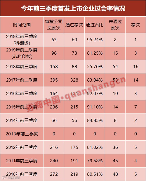 就非科创板企业的从过会率来看,大幅度高于2018年同期的55.7%,不过把时间延展至近十年来,今年前三季度的过会率略微低于过去十年的平均过会率,据统计,过去十年前三季度的IPO平均过会率为81.44%。