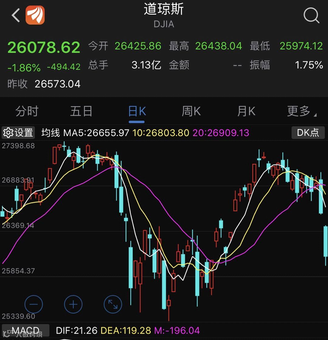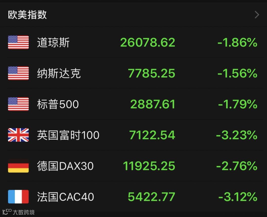 再来看看美国股市。截至收盘,道指跌1.86%,报26078.62点,标普500跌1.79%,报2887.61点,纳指跌1.56%,报7785.25点。道指十月份两个交易日跌838点。