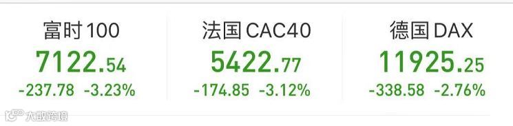 北京时间昨天晚上,先收盘的欧洲股市三大股指大幅收跌,均创逾一个月以来新低。德国DAX指数跌2.76%,报11925.25点,法国CAC40指数跌3.12%,报5422.77点,英国富时100指数跌3.23%,报7122.54点。