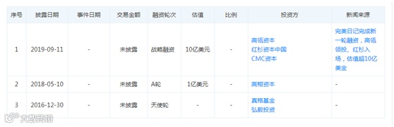 另据天眼查显示,完美日记新一轮融资估值达10亿美元(约69亿人民币),此次融资投资机构为高瓴资本、红杉中国、CMC资本。2018年5月10日,完美日记A轮融资估值1亿美元,高榕资本领投,仅一年时间估值暴涨9倍。