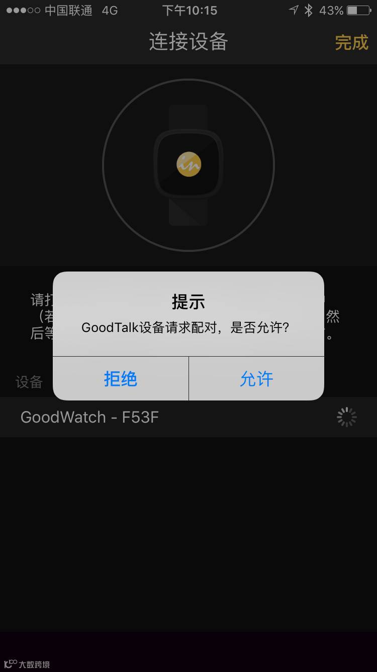 如果上面的连接处,没有出现手表的图片,那请点击“连接”,此处如果有iOS的弹框要求配对请求,如下图,请点击”取消”。