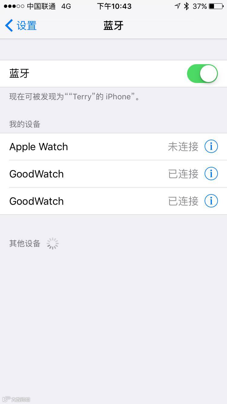 当上面连接成功后,如果您手机上的电话、信息仍无法在手表上显示的话,请到iPhone设置处理配置,如下图,如果仅有一个GoodWatch连接的话,显然是不够的。