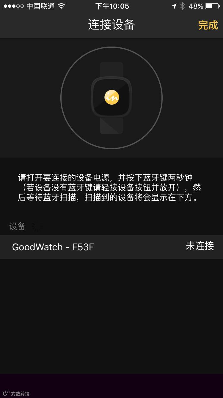 然后,再次进入GoodWatch界面,点击“连接”,系统进行扫描,点击扫描到的第一个GoodWatch设备,如下图