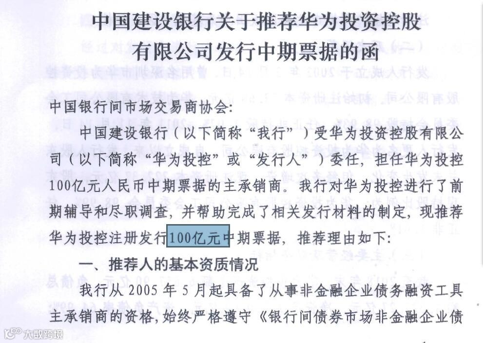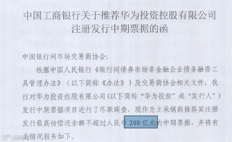 华为投资控股有限公司(下称华为)正筹划在银行间市场发行两期共计60亿元中期票据,两期发行规模各30亿元,期限均为3年;两期评级机构为联合资信评级,主体长期信用等级和债项评级均为AAA。