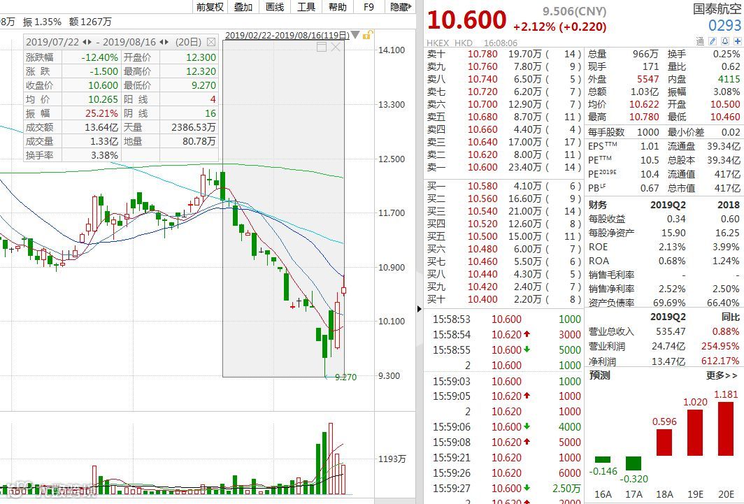 而垄断香港航空业的国泰航空先后有飞行人员参与暴力冲击被控暴动罪,让事态关注度骤升,其股价在8月13日更是创下近10年来新低,为9.27港元,自7月22日以来,国泰航空股价累计下跌12.4%。